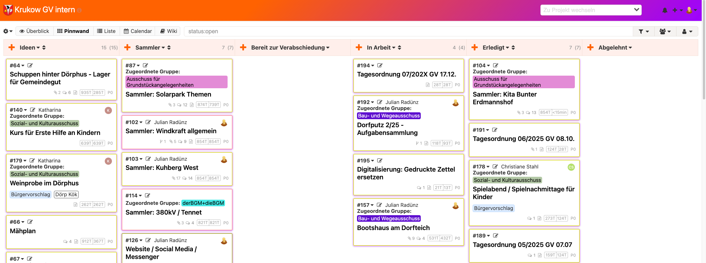 Nach der Kommunalwahl 2023 haben wir hier in Krukow eine neu zusammengesetzte Gemeindevertretung bekommen, in der gleichzeitig eine neue Wählergemeinschaft vertreten ist. Wir haben das zum Anlass gekommen, uns zuallererst so zu organisieren, dass wir mit den Überblick über die kommende Arbeit behalten und Aufgaben auch außerhalb der Protokolle transparent für alle Gemeindevertreter*innen ersichtlich sind – zuvor war das nur möglich, wenn man selber Listen geführt hat oder Protokolle wälzte.